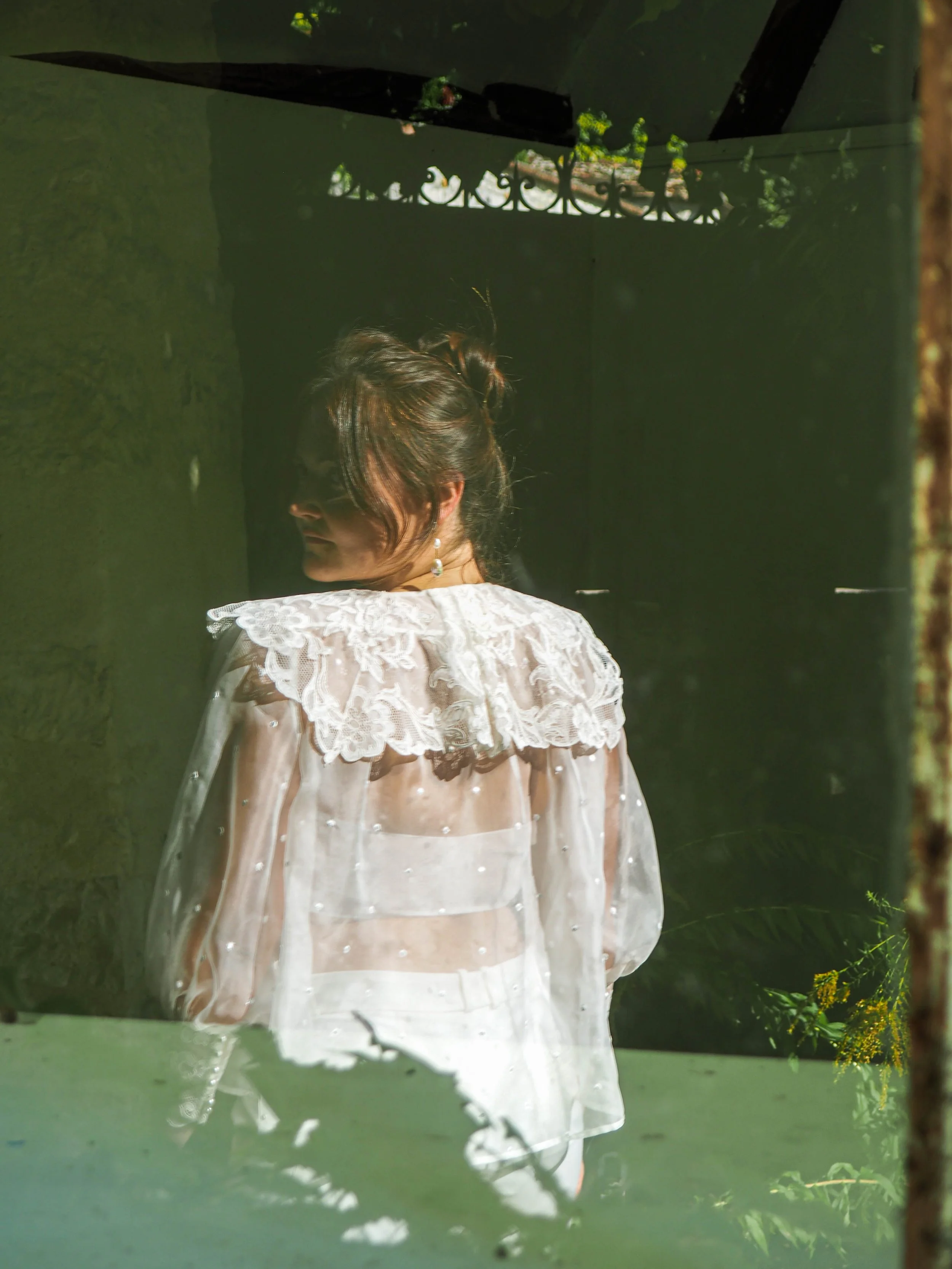 Le col aux accents vintage est large, le volume de l’organza généreux et l’ensemble est rehaussé par les touches de lumière apportées par les boutons nacrés.
