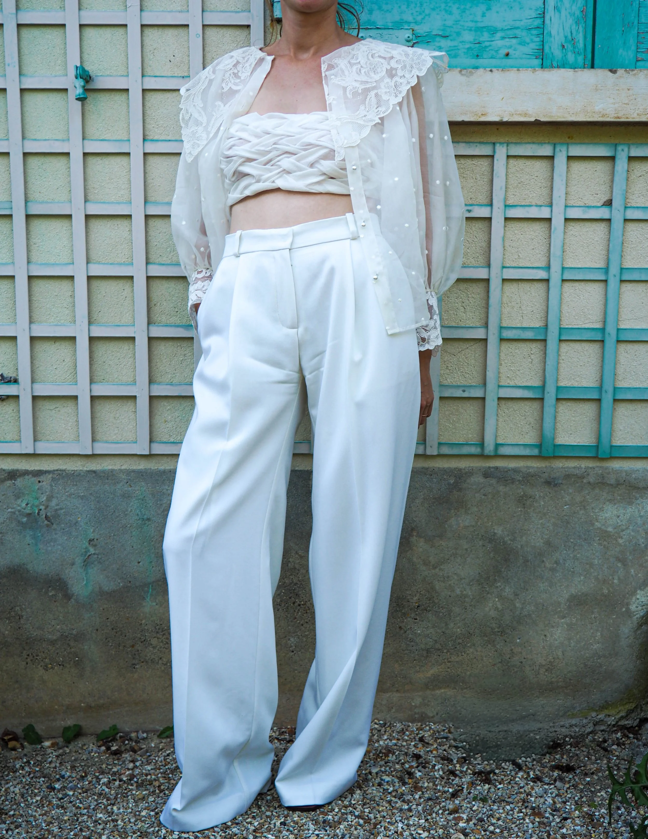 La taille est mi-haute, les jambes sont larges et agrémentées de plis italiens à la taille. Inspiré du vestiaire masculin, il est confectionné en iconique grain de poudre. Une matière d’une qualité exceptionnelle, 100% laine vierge, qui ne froisse quasiment pas.